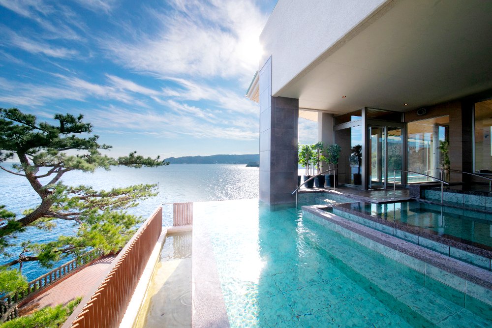 熱海温泉 ホテルニューアカオ ロイヤルウイングの温泉空と海の青さに包まれる自然と共鳴した露天風呂2018年にオープンして以来多くのお客様にご好評頂いている大浴場棟スパリウムニシキは湯船につかると海と湯舟が繋がり自然の中でゆったりと寛ぐことができます. 熱海温泉 ホテルニューアカオ ロイヤルウイングの設備アメニティ情報.